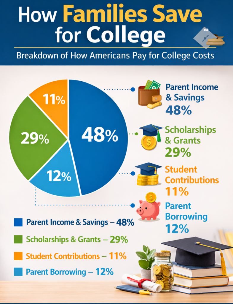 At the same time, parents’ income and savings cover nearly 48% of college costs, making family financial planning a critical part of paying for higher education.